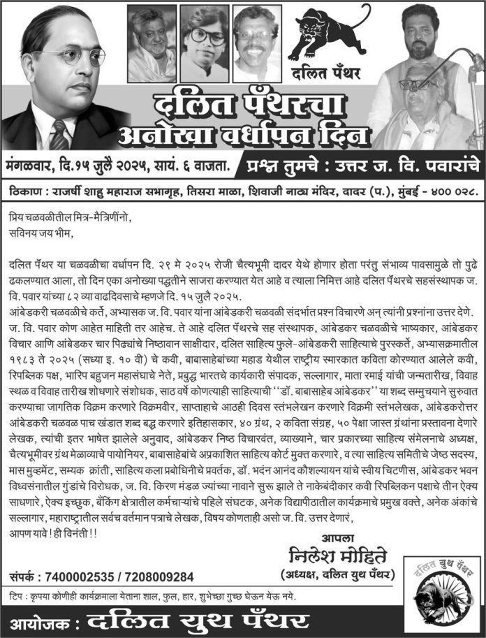 लातूर प्रतिंनिधी प्रबोधिनी न्यूज – दलित पँथर या चळवळीचा वर्धापन दि. २९ मे २०२५ रोजी चैत्यभूमी दादर येथे होणार होता परंतु संभाव्य पावसामुळे तो पुढे ढकलण्यात आला, तो दिन एका अनोख्या पद्धतीने साजरा करण्यात येत आहे व त्याला निमित्त आहे दलित पँथरचे सहसंस्थापक ज. वि. पवार यांच्या ८२ व्या वाढदिवसाचे म्हणजे मंगळवार, दि. १५ जुलै २०२५, सायं. ६ वाजता.ठिकाण : राजर्षी शाहु महाराज सभागृह, तिसरा माळा, शिवाजी नाट्य मंदिर, दादर (प.), मुंबई – ४०० ०२८ आयोजित करण्यात येत आहे.