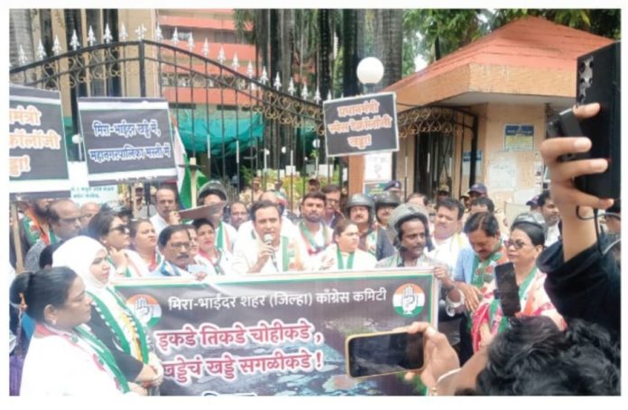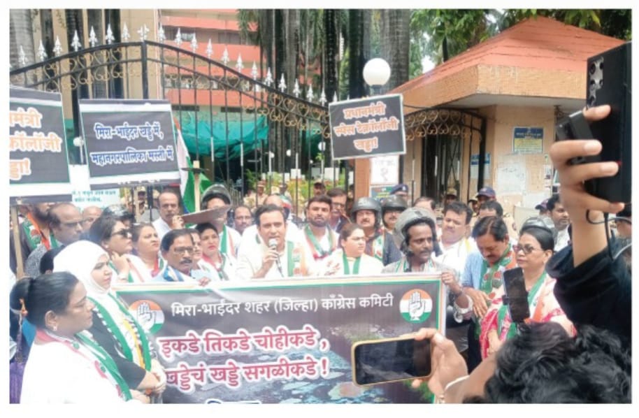 विशेष जिल्हा प्रतिनिधी, ठाणे मोजीस परमार 8104170564 : भाईंदर – रस्ते दुरुस्तीच्या नावाखाली महापालिका प्रशासन कोट्यवधी रुपये खर्च करते. परंतु कंत्राटदारांनी केलेल्या निकृष्ट कामामुळे रस्ते पहिल्याच पावसात खराब होतात. प्रशासकीय यंत्रणेतील मनमानी आणि अधिकाऱ्यांच्या जबाबदारीच्या अभावामुळे संपूर्ण शहरातील रस्त्यांवर एक भयानक आणि चिंताजनक परिस्थिती निर्माण झाली आहे. ‘रस्त्यात खड्डे की खड्ड्यांमध्ये रस्ते’ या मुद्द्यावर आयुक्तांकडून उत्तर मागण्यासाठी, मीमिर-भाईंदर शहर जिल्हा काँग्रेसने माजी आमदार मुझफ्फर हुसेन यांच्या मार्गदर्शनाखाली जिल्हाध्यक्ष प्रमोद सामंत यांच्या नेतृत्वाखाली भाईंदर पोलिस स्टेशनपासून महापालिका मुख्यालयापर्यंत निषेध मोर्चा काढला आणि महापालिका मुख्यालयाच्या प्रवेशद्वाराजवळ निषेध केला. यावेळी जोरदार घोषणाबाजी करण्यात आली. काँग्रेसच्या एका शिष्टमंडळाने कडक पोलिस बंदोबस्तात महापालिका आयुक्त आणि प्रशासक राधाबिनोद शर्मा यांची भेट घेतली आणि रस्त्यांवरील खड्ड्यांमुळे निर्माण झालेल्या समस्येवर तोडगा काढण्याची मागणी केली.