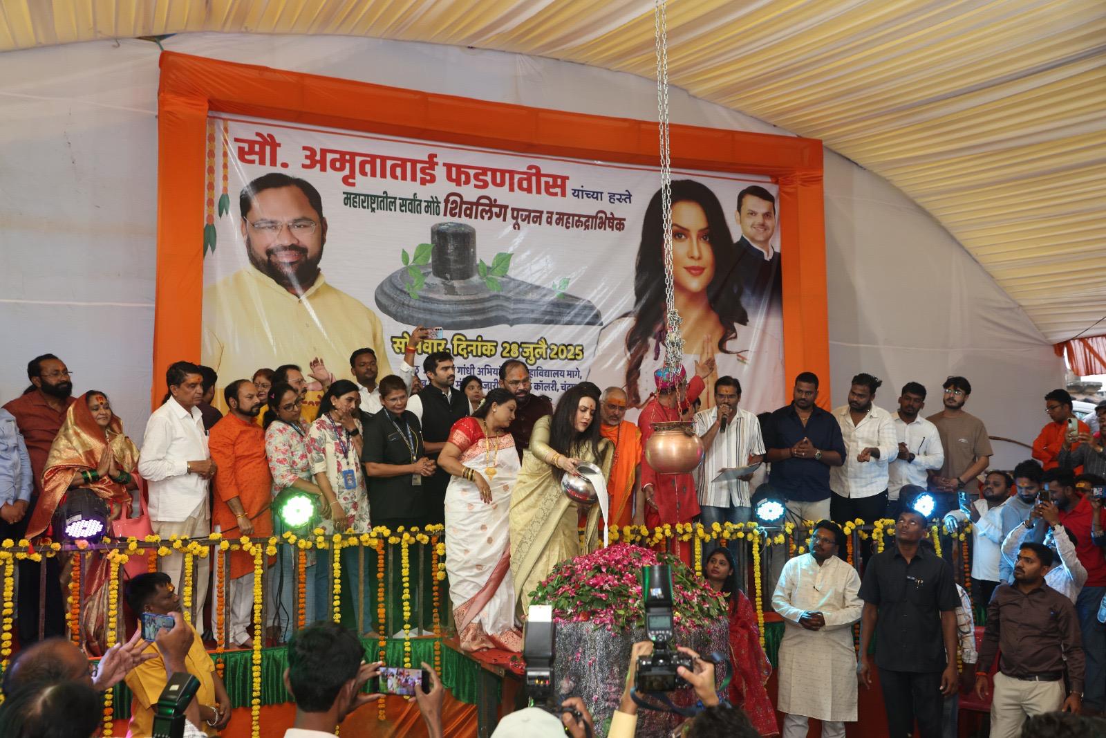 दरम्यान, या कार्यक्रमासाठी अमृता फडणवीस आज चंद्रपुरात दाखल झाल्या. सायंकाळी चार वाजता त्या कार्यक्रमस्थळी पोहोचल्या. कावड घेऊन त्या शिवलिंगाजवळ आल्या आणि राज्यभरातून आणलेल्या ५५ नद्यांच्या पवित्र जलाने व १ लाख ५५ हजार बेलपत्रांनी शिवलिंगाचे जलाभिषेक केले. त्यानंतर त्यांनी शिवलिंगाची आरती केली.