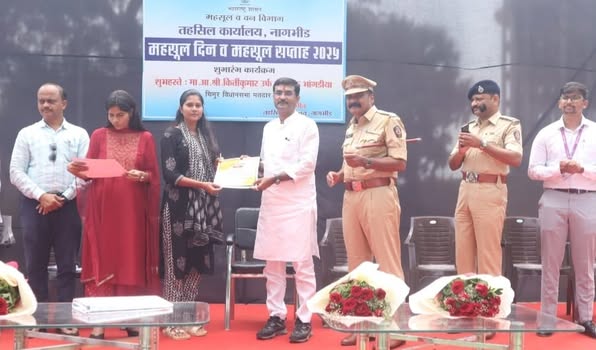 नागभीड – दि. 2 : राज्य शासनाच्या निर्देशाप्रमाणे 1 ऑगस्ट रोजी महसूल दिन तर 1 ते 7 ऑगस्ट 2025 या कालावधीत महसूल सप्ताह साजरा करण्यात येणार आहे. या सप्ताहात नागभीड तालुका प्रशासनातर्फे अभिनव उपक्रमांचे आयोजन करण्यात आले आहे. शुक्रवारी चिमूर विधानसभा क्षेत्राचे आमदार कीर्तिकुमार ऊर्फ बंटी भांगडीया यांच्या हस्ते महसूल सप्ताहाचा शुभारंभ करण्यात आला.