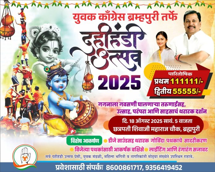रविंद्र मैंद ब्रम्हपुरी तालुका प्रतिनिधी प्रबोधिनी न्यूज – ब्रह्मपुरीतील छत्रपती शिवाजी महाराज चौकात १८ ऑगस्ट ला सायंकाळी ५ वाजता युवक काँग्रेस ब्रह्मपुरी तर्फे दहीहंडी उत्सव २०२५ चे भव्य आयोजन करण्यात आले असून या उत्सवामुळे तरुणांमध्ये नवचैतन्य संचारत आहे. पारंपरिक उत्साह, सांस्कृतिक स्नेह व गोविंदांच्या साहसी खेळाचे दर्शन घडवणारा हा कार्यक्रम तरुणाईसाठी प्रेरणादायी आहे.