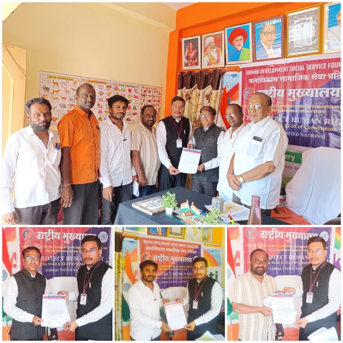 उमरी प्रतिनिधी प्रबोधिनी न्युज नेटवर्क – मानोविकास सामाजिक सेवा फाऊंडेशन मानव अधिकार समाजसेवी संस्थेचा महाराष्ट्र राज्य, जिल्हा पदाधिकारी कार्यकारणी यांची राष्ट्रीय अध्यक्ष प्रा.दादासाहेब ऊर्फ रूपेशकुमार श्रीरामवार यांच्या उपस्थितीत राष्ट्रीय मुख्यालय येथे नुतन पदाधिकारी यांची नियुकती करत नियुक्ती पत्र पदाची शपथ देण्यात आली.
