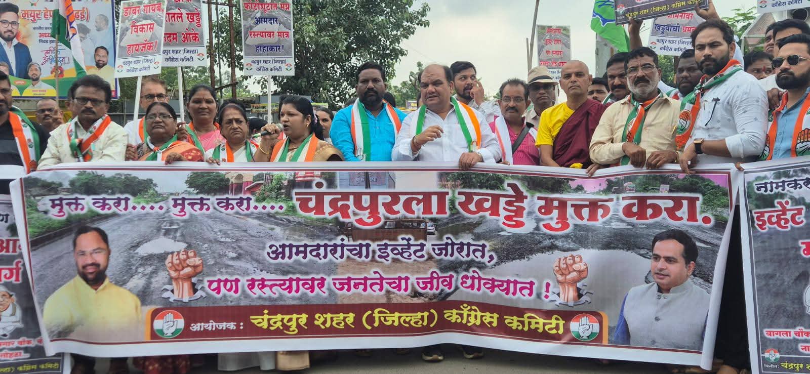 प्रशांत रामटेके संपादक प्रबोधिनी न्युज – चंद्रपूर शहरातील महात्मा गांधी रोड, कस्तुरबा गांधी रोड, पठाणपुरा, इंजिनिअरिंग कॉलेज परिसर, जटपुरा गेट आदी प्रमुख रस्त्यांची अवस्था सध्या अत्यंत दयनीय बनली आहे. रस्त्यांवरील मोठमोठे खड्डे, उखडलेले डांबर आणि धुळीच्या ढिगाऱ्यांमुळे नागरिकांचे जनजीवन विस्कळीत झाले आहे. यामुळे वाहतूक खोळंबते असून अपघात, श्वसन विकार यांसारख्या गंभीर समस्या उद्भवत आहेत. या पार्श्वभूमीवर चंद्रपूर शहर काँग्रेसने जिल्हाध्यक्ष रितेश (रामू) तिवारी यांच्या नेतृत्वात तीव्र आंदोलन छेडले. बागला चौक ते कामगार चौक या मार्गावरील खड्ड्यांना प्रतीकात्मक नाव देत ‘इव्हेंट आमदार मार्ग’ असे नामकरण करण्यात आले. “मुक्त करा… मुक्त करा… चंद्रपूरला खड्डे मुक्त करा!”, “आमदारांचा इव्हेंट जोरात… पण रस्त्यावर जनतेचा जीव धोक्यात!” अशा जोरदार घोषणा देत कार्यकर्त्यांनी आपला संताप व्यक्त केला.