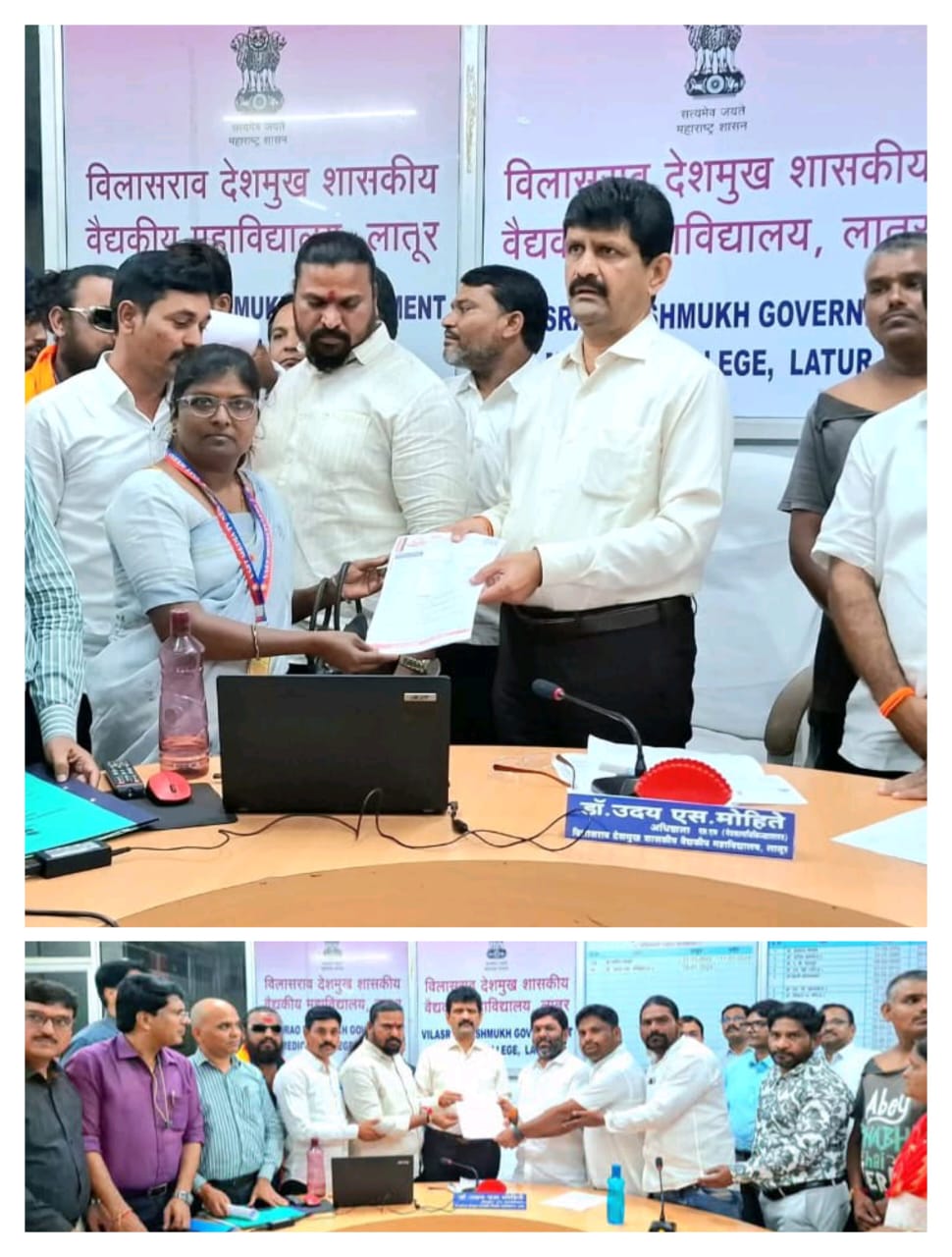 लातूर प्रतिनिधी लक्ष्मण कांबळे : विलासराव देशमुख शासकीय वैद्यकीय रुग्णालय येथे काल दिनांक 12 ऑगस्ट रोजी प्रस्तुतीसाठी रुग्णालयात दाखल असलेल्या रुग्णाच्या पतीला महाराष्ट्र सुरक्षा बल च्या सुरक्षारक्षकांनी गेटवरच अडवून बेदम मारहाण केल्याप्रकरणी भिम आर्मी तसेच विविध सामाजिक संघटना व पक्ष पदाधिकारी यांच्या शिष्टमंडळाने रुग्णालयाचे अधिष्ठाता उदय मोहिते यांची आज दिनांक 13 ऑगस्ट रोजी दुपारी दोन वाजता भेट घेऊन सदर प्रकरणी तात्काळ चौकशी करून दोषींवर कडक कारवाई करण्यात यावी. त्यांना सेवेतून कमी करण्यात यावे अशा आशयाचे निवेदन देण्यात आले.