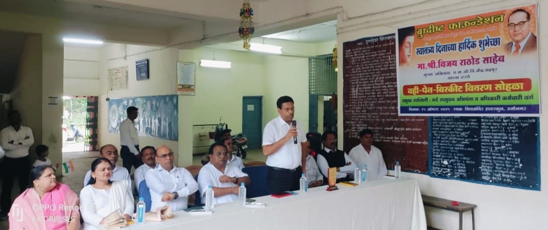 बुद्धीष्ठ फाउंडेशन ऊर्जानगरच्या वतीने दि १५ आगस्ट स्वातंत्र्य दिनानिमित्त आयोजित कार्यक्रमाला अध्यक्ष मा.विजय राठोड मुख्य अभियंता चंद्रपूर महाऔष्णिक विज केंद्र ,प्रमुख अतिथी उपमुख्य अभियंता मा.डाँ. भूषण शिंदे, मा.रवींद्र सोनकुसरे,मा.दिलीप पवार मुख्याध्यापक विद्यामंदिर हायस्कुल ,नरेंद्र रहाटे संस्थापक अध्यक्ष बुद्धीष्ठ फाउंडेशन तसेच सत्कारमूर्ती मा.श्री व सौ पान्हेरकर,वंदना मनपे,लक्ष्मण बोरकर अध्यक्ष बुद्धीष्ठ फाउंडेशन,मनसे संघटनेचे अध्यक्ष देवराव कोंडेकर, सचिव देवेंद्र मालुसरे यांची उपस्थिती होती.यावेळी मान्यवरांच्या हस्ते नुकताच डाँ बाबासाहेब आंबेडकर समाजभूषण पुरस्कार प्राप्त दाम्पत्य श्रीराम पान्हेरकर व सुनंदा पान्हेरकर व विश्वकर्मा गुणवंत कामगार पुरस्कार प्राप्त वंदना मनपे यांच्या सन्मान करण्यात आला तसेच महाराष्ट्र नवनिर्माण विज कामगार संघटनेच्या नवनियुक्त अध्यक्ष देवराव कोंडेकर, सचिव देवेंद्र मालुसरे,कार्याध्यक्ष नारायण चव्हाण,कोष्याध्यक्ष अशोक लोहार यांचा मुख्य अभियंता यांच्या हस्ते शुभेच्छा देऊन सत्कार करण्यात आला.विद्यामंदिर शाळेच्या संपूर्ण विद्यार्थ्यांना बुद्धीष्ठ फाउंडेशनच्या वतीने मान्यवरांच्या हस्ते बुक,पेन व खाऊचे वितरण करण्यात आले.कार्यक्रमाचे संचलन सुभाष शेडमाके यांनी केले तर आभार देवराव कोंडेकर यांनी मानले. हा कार्यक्रम यशस्वीतेसाठी याशील सातार्डे ,राहुल दुपारे ,परमेश्वर गोवर्धन ,राहुल पाहुणे ,सचिन गायकवाड,धर्मेंद्र कनाके,धनराज सपकाळे, सुनील काटकर, किसन अरदडे, शुभम बोरकर, चहांदे, रामटेके,रंगारी,नागदेवते, मालती पाटील इत्यादीनी सहकार्य केले .