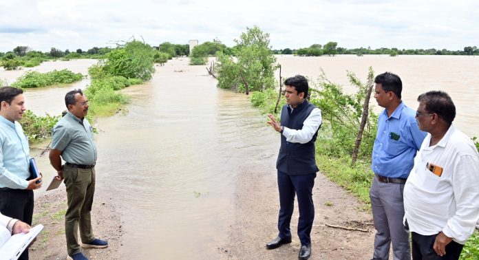 शिवनी चोर परिसराला भेट : जिल्हाधिकारी विनय गौडा यांनी चंद्रपूर तालुक्यातील शिवनी चोर परिसरातील पूरग्रस्त भागाला भेट दिली. वर्धा नदीच्या बॅक वॉटरमुळे येथील परिसरातील पिके मोठ्या प्रमाणात पाण्याखाली आली आहेत. पूर ओसरल्यावर नुकसानग्रस्त शेतमालाचे पंचनामे अचूक पध्दतीने करावे. त्यासाठी उपविभागीय अधिका-यांनी योग्य नियोजन करावे. पंचनामे करण्यात आलेल्या शेतीची व शेतक-यांची यादी ग्रामपंचायतीमध्ये लावावी. तसेच पंचनामे करतांना संबंधित मालकाचे नाव व त्यांचा मोबाईल क्रमांक नोंदवावा, जेणेकरून नुकसान भरपाई देताना कोणतीही अडचण येणार नाही.