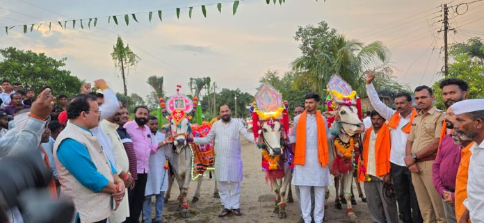 चंद्रपूर : चंद्रपूर जिल्ह्यातील साखरवाही येथे दरवर्षीप्रमाणे यंदाही बैलपोळा उत्सव पारंपरिक पद्धतीने आणि मोठ्या उत्साहात साजरा करण्यात आला. या सोहळ्याला आमदार किशोर जोरगेवार उपस्थित राहून सहभागी झाले. यावेळी त्यांनी बैलजोडीची पूजा करून सन्मान केला तसेच शेतकऱ्यांशी संवाद साधला.