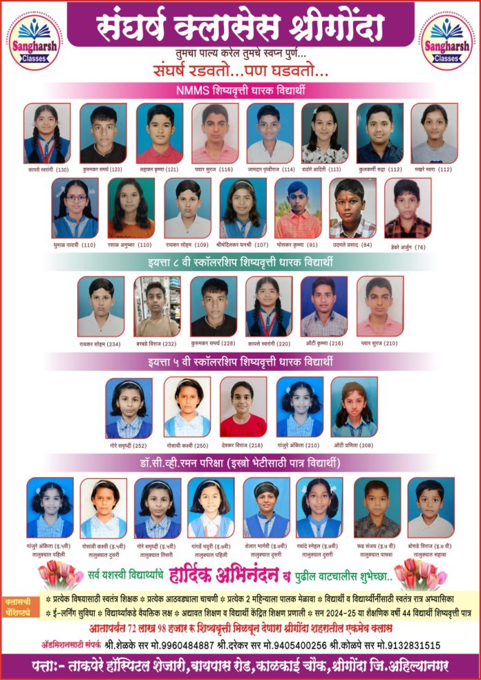 संघर्ष क्लासेस मध्येल 8 वी चे या वर्षी 16 विद्यार्थीची निवड झाली.या विद्यार्थ्यांना प्रत्येकी 48 हजार रुपये शिष्यवृत्ती मिळणार आहे, कापसे स्वरांगी, कुरुमकर समर्थ, लाहकर कृष्णा ,पवार सुरज, जामदार पृथ्वीराज, वाठोरे आदिती, रुद्र कुलकर्णी, मखरेश्वरा, धुमाळ गायत्री, रसाळ अनुष्का, सोहम रायकर, धनश्री श्रीमंदिलकर, भोस कृष्णा, उदमले प्रसाद , अर्जुन डेबरे,