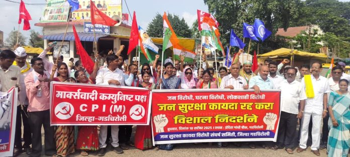 गडचिरोलीसारख्या आदिवासीबहुल, संवेदनशील आणि मागास जिल्ह्यातील जनतेवर अशा दडपशाही स्वरूपाच्या कायद्याचा विपरित परिणाम होईल. स्थानिक कार्यकर्ते, सामाजिक कार्यकर्ते, पत्रकार व सामान्य नागरिक यांच्यावर अवाजवी पोलीस नियंत्रण येईल. विरोधी मत मांडणाऱ्या लोकांना अन्यायकारक कारवायांचा सामना करावा लागेल. या विधेयकामुळे नागरिकांच्या संविधानिक हक्कांची पायमल्ली होणार असून, हे विधेयक लोकशाही मूल्यांना धरून नाही. यामुळे महाराष्ट्रात पोलिसी राजवट निर्माण होण्याची शक्यता आहे. त्यामुळे जनतेच्या भावना व लोकशाही मूल्यांचा विचार करता “महाराष्ट्र जनसुरक्षा विधेयक २०२४” तत्काळ रद्द करण्यात यावा या मागणीला घेऊन इंदिरा गांधी चौक गडचिरोली येथे सर्वपक्षीय धरणे आंदोलन करण्यात आले.
