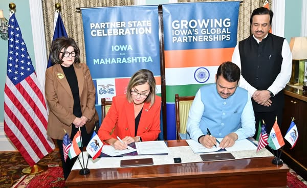 अमेरिकेतील कृषिप्रधान आयोवा राज्याशी महाराष्ट्राने ऐतिहासिक सामंजस्य करार केला. आयोवा हे अमेरिकेचे ‘फूड बास्केट’ म्हणून प्रसिद्ध असून शेती व कृषितंत्रज्ञान क्षेत्रातील प्रगत राज्य मानले जाते. या कराराद्वारे महाराष्ट्रात कृत्रिम बुद्धिमत्ता आधारित शेती, कृषितंत्रज्ञान, डिजिटायझेशन, आरोग्य, व्यावसायिक प्रशिक्षण व कौशल्य विकास, पर्यटन, क्रीडा, जैवतंत्रज्ञान, सामाजिक-आर्थिक सेवा, नवीकरणीय ऊर्जा आणि पायाभूत सुविधा विकास या महत्त्वाच्या क्षेत्रांत नव्या संधी निर्माण होणार असल्याचा विश्वास मुख्यमंत्री देवेंद्र फडणवीस यांनी व्यक्त केला.