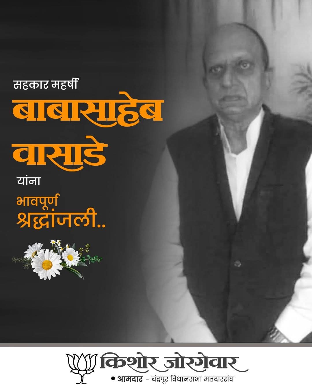 तृप्ती चिद्रावार कार्यकारी संपादिका प्रबोधिनी न्युज – सहकार आणि शिक्षण क्षेत्रात आपले संपूर्ण आयुष्य वाहून घेतलेले, सहकार व शिक्षण महर्षी बाबासाहेब वासाडे यांचे दुःखद निधन हे संपूर्ण समाजासाठी एक अपूरणीय नुकसान आहे. त्यांच्या जाण्याने सहकार व शिक्षण चळवळीचे आधारस्तंभ हरपले असल्याची प्रतिक्रिया आपल्या शोकसंदेशातून आमदार किशोर जोरगेवार यांनी व्यक्त केली आहे.