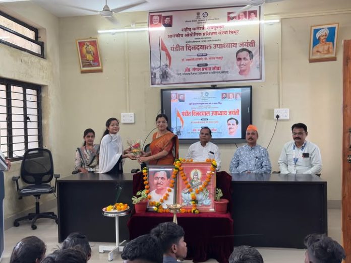 चंद्रपूर, दि. 30 : शहीद बालाजी रायपूरकर शासकीय औद्योगिक प्रशिक्षण संस्था, चिमूर येथे पंडित दिनदयाल उपाध्याय यांची जयंती साजरी करण्यात आली. या कार्यक्रमात ‘एकात्म मानवतावाद, अंत्योदय विचारक, तत्त्वज्ञ आणि प्रेरणास्त्रोत’ यावर प्रामुख्याने मुलांना मार्गदर्शन करण्यात आले. कार्यक्रमाचे अध्यक्ष म्हणून संस्थेच्या प्राचार्य प्रणाली दहाटे तर प्रमुख पाहुणे म्हणून संस्थेचे व्यवस्थापन समितीचे अध्यक्ष अनिल मेहेर, गट निदेशिका पी.आर. बलकी, डॉ. श्यामजी हटवादे उपस्थित होते.