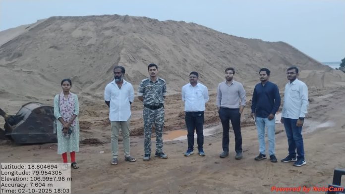 कुशल जैन यांच्या पथकाने ०२ ऑक्टोंबर, २०२५ रोजी अंकिसा माल, चिंतरेवला व मद्दीकुंठा येथे तपासणीची कारवाई केली. यावेळी अंकिसा माल येथे सर्व्हे नंबर ९०८ मधील रेती साठ्यात ६४ ब्रास आणि सर्व्हे नंबर ६९० व ६९१ मधील साठ्यात ५९ ब्रास रेतीची तफावत (कमी साठा) आढळली आहे. या दोन्ही प्रकरणात चौकशी करण्यात येत आहे. तर मद्दीकुंठा येथील सर्व्हे नंबर ५३३ मध्ये परवानगी असलेल्या ठिकाणी भेट दिली असता, रेतीसाठा दुसऱ्याच जागेवर म्हणजेच सर्व्हे नंबर ३५६ जागेवर असल्याचे आढळले. मोजमाप अहवालानुसार, या ठिकाणी एकूण १५ हजार ६६५ ब्रास रेतीसाठा दिसून आला. साठवणूक आणि वाहतुकीसाठी संबंधितांकडे कोणताही वैध परवाना उपलब्ध नसल्यामुळे, हा साठा अवैध घोषित करून जप्त करण्यात आला. याशिवाय, गौण खनिज उत्खनन व वाहतुकीसाठी वापरण्यात आलेली २ जेसीबी मशीन, १ पोकलैंड मशीन आणि ५ ट्रक ही वाहने देखील जप्त करण्यात आली आहेत.