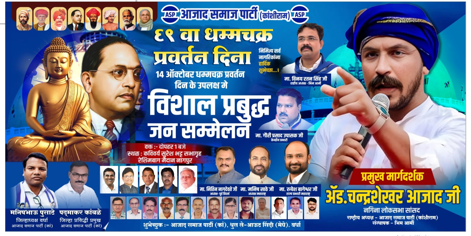 वर्धा प्रतिनिधी प्रबोधिनी न्युज – वर्धा महाराष्ट्र सामाजिक आणि राजकीय चळवळीला गतिमान करण्याकरता बुद्ध फुले शाहू आंबेडकर यांच्या विचारधारेवर आधारित नागपूर येथे “विशाल प्रबुद्ध जनसंमेलन नागपूर येथे 69 व्या धम्मचक्र प्रवर्तन दिन 14 ऑक्टोंबर धम्मचक्र प्रवर्तन दिनाचे औचित्य साधून आजाद समाज पार्टी (कांशीराम), च्या वतीने कार्यक्रमाचे स्थळ कविवर्य सुरेश भट सभागृह रेशमी बाग मैदान नागपूर येथे दुपारी 1 वाजता विशाल प्रबुद्ध जनसंमेलन चे आयोजन करण्यात आले आहे. या कार्यक्रमाचे प्रमुख मार्गदर्शक ऍड. चंद्रशेखर आझाद जी( आजाद समाज पार्टी राष्ट्रीय अध्यक्ष), तसेच प्रमुख उपस्थिती मध्ये गौरी प्रसाद उपासक (माजी मंत्री, उत्तर प्रदेश सरकार व केंद्रीय प्रभारी महाराष्ट्र), मा. रुपेश जी बागेश्वर राज्य प्रभारी, मनीष साठे प्रदेशाध्यक्ष, डॉ. मानसी ताई पवार उपाध्यक्ष, यांच्यासह प्रमुख पदाधिकारी उपस्थित राहणार आहेत. या संमेलनात राज्यभरातील पदाधिकारी ,कार्यकर्ते, आणि प्रबुद्ध समाजातील नागरिक मोठ्या संख्येने सहभागी होणार असून सामाजिक न्याय, सविधान रक्षण, युवकाचे राजकीय सशक्तिकरण आणि बहुजन एकतेचा संदेश या माध्यमातून देण्यात येणार आहे. या कार्यक्रमाला हजारोच्या संख्येने उपस्थित रहावे असे आव्हान वर्धा जिल्हा अध्यक्ष मनीष फुसाटे आजाद समाज पार्टी(कांशीराम), तसेच वर्धा जिल्हा मीडिया प्रमुख पद्माकर कांबळे यांनी केले आहे.