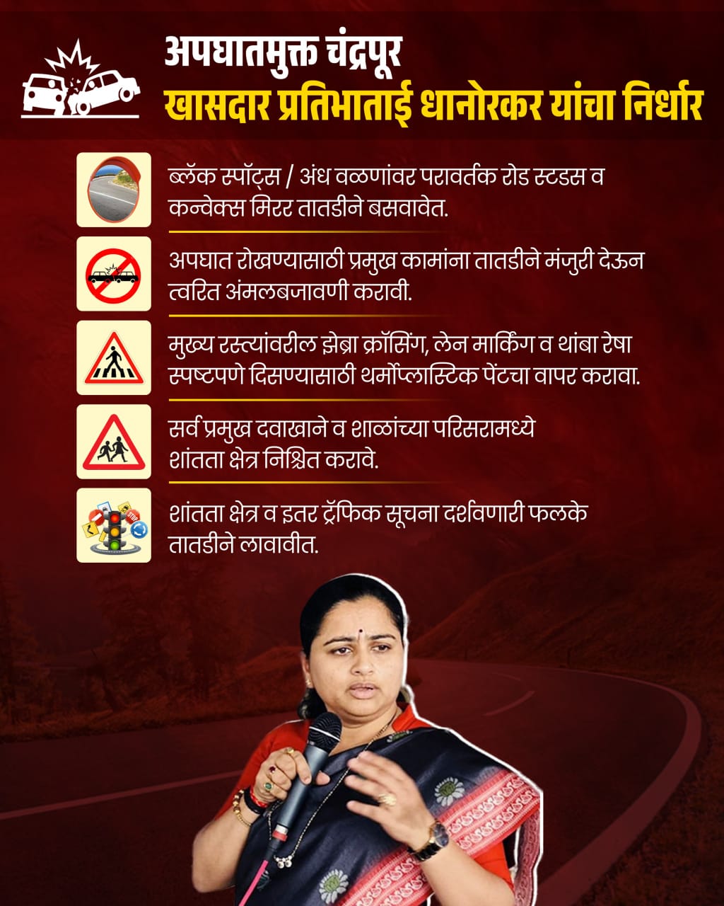 शहरवासीयांच्या सुरक्षिततेला सर्वोच्च प्राधान्य देत, खासदार प्रतिभा धानोरकर यांनी रस्ते अपघात रोखण्यासाठी प्रमुख कामांना तातडीने मंजुरी देऊन त्यांची अंमलबजावणी त्वरित सुरू करण्याची अपेक्षा व्यक्त केली आहे.