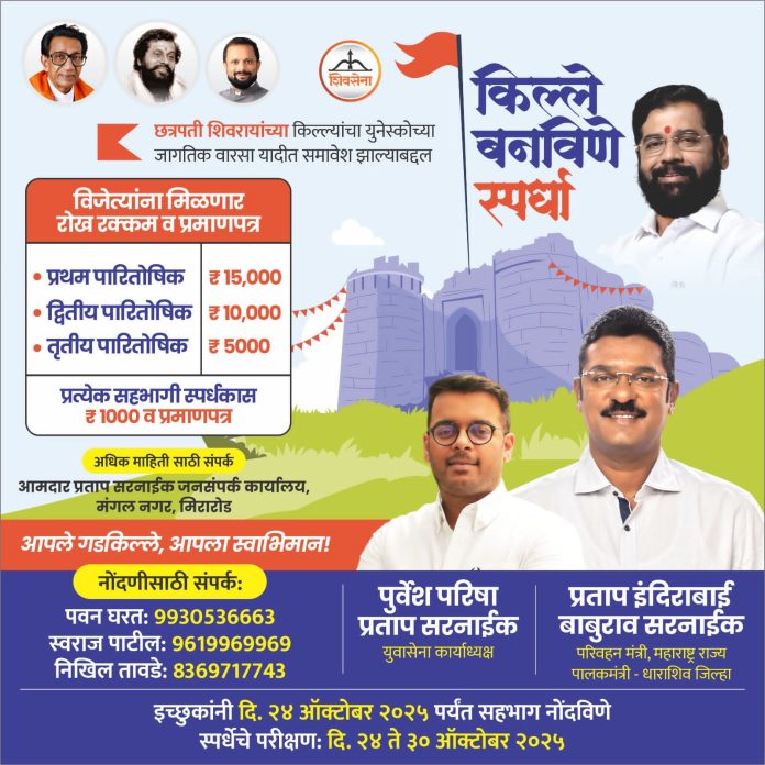 मीरा-भाईंदर : युनेस्कोने नुकतेच छत्रपती शिवाजी महाराजांच्या बारा दुर्गांना जागतिक वारसा स्थळांच्या यादीत स्थान दिले आहे. या ऐतिहासिक आणि अभिमानास्पद क्षण साजरा करण्यासाठी महाराष्ट्र राज्य परिवहन मंत्री तथा धाराशिव जिल्हा पालकमंत्री मा.ना.श्री. प्रताप इंदिराबाई बाबुराव सरनाईक आणि युवसेना कार्याध्यक्ष पुर्वेश परिषा प्रताप सरनाईक यांच्या मार्गदर्शनाखाली मिरा-भाईंदर शिवसेनेमार्फत मीरा-भाईंदर शहरात ‘किल्ले बनविणे स्पर्धेचे’ आयोजन करण्यात आले आहे. या स्पर्धेत सहभागी होण्याकरिता मीरा-भाईंदरमधील इच्छुक स्पर्धकांना २४ ऑक्टोबर २०२५ पर्यंत सहभाग नोंदविता येणार आहे. या स्पर्धेचे परीक्षण इतिहासाचे जाणकार दिनांक २४ ऑक्टोबर ते ३० ऑक्टोबर या दरम्यान करणार आहेत.