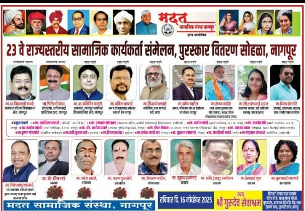 नागपूर प्रतिनिधी प्रबोधिनी न्युज नेटवर्क : मदत सामाजिक संस्थेचे अध्यक्ष मा.अँड.निल लाडे आणि संस्थापक सचिव दिनेशबाबु वाघमारे आणि संस्थेच्या ज्येष्ठ मार्गदर्शिका सुनंदा वाघमारे यांच्या पुढाकाराने कार्यकारिणीच्या मार्गदर्शनात,घटनाकार महामानव विश्वरत्न डॉ. बाबासाहेब आंबेडकर यांना अभिप्रेत असलेला सन्मान समाजसेवेचे व्रत घेतलेल्या तळागाळातील सामान्य बहुजन समाजाच्या सामाजिक कार्यकर्त्याना मिळाला पाहीजे.बहुजनांचे सेवाव्रती कार्य जगाला माहिती होऊन, सामाजिक कार्यकर्त्याचे मनोबल उंचावण्याच्या उदात्त हेतूने संस्थापक सचिव दिनेशबाबू वाघमारे हे स्वतः तन मन धनाने सेवारत राहून,दरवर्षी त्यांनी स्वतः स्थापन केलेल्या,मदत सामाजिक संस्थेच्या वतीने,महाराष्ट्राच्या प्रत्येक जिल्ह्यातीलच नव्हे तर संपूर्ण भारतातील सेवाव्रती कोहिनूर व्यक्तींची पुरस्काराकरीता निवड करून राज्यस्तरीय कार्यकर्ता महासंमेलनाचे आयोजन करीत असतात.रविवार दि.१६ नोव्हेंबर २०२५ रोजी श्री.गुरुदेव सेवाश्रम, दिवंगत डॉ. प्रा. प्रकाशजी सोनक परिसर सभागृह नागपूर येथे २३ वे राज्यस्तरिय सामाजिक कार्यकर्ता संमेलन व भव्य पुरस्कार सोहळा संपन्न होत आहे. या संमेलनात भारतिय संविधान व लोकशाहीच्या भवितव्याविषयी कार्यकर्त्यांची भूमिका, फुले, शाहू, आंबेडकर चळवळीतील सामाजिक कार्यकर्त्यांच्या अडीअडचणी या विषयावर सखोल चर्चा होऊन सामाजिक कार्यकर्त्याच्या सामाजिक विकासाकरीता प्रस्ताव घेण्यात येवून शासनाला पाठविण्यात येतील. तसेच तमाम महाराष्ट्रासह भारतवर्षातील विविध कार्य क्षेत्रातील सामाजिक सेवाव्रती कार्यकर्त्याची दखल संस्थेने घेतलेली असून त्यामध्ये संघरत्न नरवाडे,विनोद पंडीत, विदर्भ लोककलावंत संघटना माहिलाध्यक्षा तथा ग्रामिण पत्रकार कांता लोखंडे, इंदिरा मात्रे,गानकोकीळा आशा सुरवाडे, स्त्री शक्ती मंच महाराष्ट्र संस्थापक अध्यक्षा शारदा भुयार, दिपीका खांडेकर, कल्पना साबळे,प्रतिभा ढोक, सुरेखा धर्माळे, विमल वाडकर, संतोषी भंडारी,निता मदनकार, उज्वला बोबडे, शारदा धनोकार, वंदना वाटाने, भजनी कलावंत मेघा आशिष गुल्हाने, प्रतिभा अर्डक,माजी न्यायाधिश डॉ. संतोषकुमार जयस्वाल, श्रीमद् भागवत कथा प्रवक्ते हभप. अजाबराव महाराज ढळे, पत्रकार मंगेश देशमुख,महाराष्ट्र साप्ताहिक ग्रामिण पत्रकार परिषद प्रदेशाध्यक्ष – विजयबाबू तेलगोटे, ईश्वरदास इंगळे,पत्रकार – विनोदकुमार गणवीर, पत्रकार – कालूभाई तवंगर, हवामान अभ्यासक – गोपाल विश्वनाथ गावंडे, झुंजार पत्रकार उषाताई नाईक, माधुरी वार्डेकर इत्यादी सेवाव्रती सामाजिक कार्यकर्त्यांच्या सेवेचा गुणगौरव म्हणून त्यांना विविध राज्यस्तरीय पुरस्कार