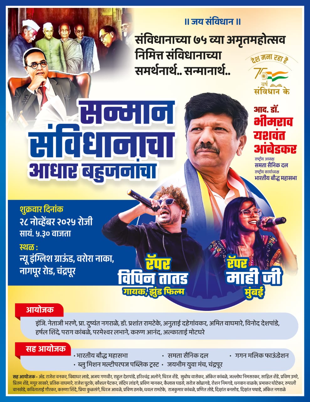 प्रशांत रामटेके संपादक प्रबोधिनी न्युज – भारतीय संविधानाच्या ७५ व्या अमृतमहोत्सवानिमित्त, संविधानाच्या समर्थनार्थ आणि सन्मानार्थ, चंद्रपूर येथे भव्य ‘ सन्मान संवींधानाचा आधार बहुजनांचा’ हा सोहळा आयोजित करण्यात आला आहे. हा कार्यक्रम शुक्रवार, दिनांक २८ नोव्हेंबर २०२५ रोजी सायं. ५.३० वाजता न्यू इंग्लिश ग्राउंड, वरोरा नाका, नागपूर रोड, चंद्रपूर येथे होणार आहे.
