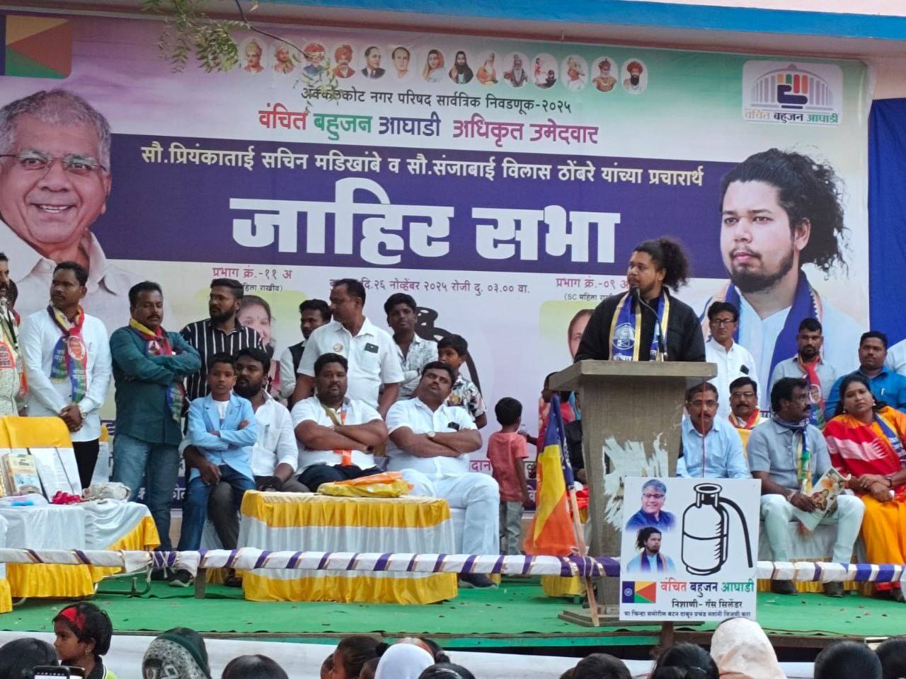 अक्कलकोट : अक्कलकोट नगर पालिका निवडणुकीत वंचित बहुजन आघाडीच्या उमेदवार प्रियांका मडीखांबे आणि संजाबाई ठोंबरे यांच्या प्रचारार्थ आयोजित जाहीर सभेला आदरणीय सुजात आंबेडकर यांची प्रभावी उपस्थिती लाभली. त्यांच्या सभा संबोधनाने कार्यकर्त्यांमध्ये उत्साह संचारला असून प्रचाराला जोम मिळाला आहे.