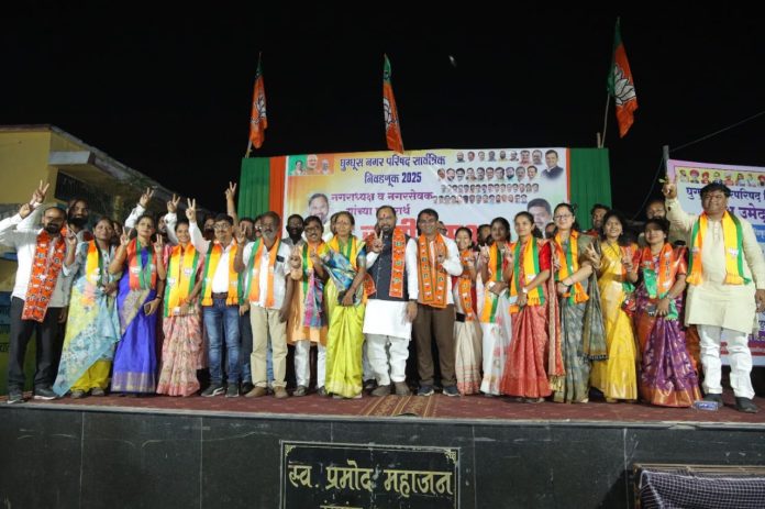 घुग्घुस प्रतिनिधी प्रबोधिनी न्युज – घुग्घुस नगर परिषद सार्वत्रिक निवडणूक 2025 च्या पार्श्वभूमीवर भारतीय जनता पार्टी, घुग्घुसतर्फे नगराध्यक्ष व नगरसेवक पदाच्या उमेदवारांच्या प्रचारार्थ गुरुवारी आमदार किशोर जोरगेवार आणि आमदार देवराव भोंगळे यांच्या प्रमूख उपस्थितीत भव्य पदयात्रेचे आयोजन करण्यात आले. टिळक नगर येथून निघालेल्या पदयात्रेचे आठवडी बाजार चौक येथ सभेत रूपांतर झाले. यावेळी बोलतांना आमदार किशोर जोरगेवार यांनी विकासाच्या मुद्यावर आपण निवडणुकीला समोर जात असुन नगराध्यक्ष पदासह सर्व नगर सेवकांना निवडणुन देण्याचे आवाहण आमदार किशोर जोरगेवार यांनी केली.