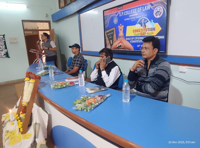 दिनांक 26 नोव्हेंबर संविधान दिवसाच्या निमित्ताने संविधान मसुदा समितीचे प्रमुख भारतरत्न डॉ.बी.आर. आंबेडकर यांच्या प्रतिमेला पुष्पहार अर्पण करून अभिवादन करण्यात आले.त्यानंतर संविधान उद्देश पत्रिकेचे वाचन करण्यात आले तसेच संविधान संक्षिप्त पुस्तिका वितरित करण्यात आली. सदर कार्यक्रमाच्या अध्यक्ष माननीय प्राचार्य एजाज शेख सर , प्रमुख मार्गदर्शक एल एल एम विभागप्रमुख प्रा. डॉक्टर पंकज काकडे सर, एलएलबी तीन वर्षीय अभ्यासक्रम प्रमुख प्रा.डॉक्टर अभय बुटले सर, राष्ट्रीय सेवा योजना कार्यक्रम अधिकारी, प्रा. नंदकिशोर भंडारी यांची मंचावर प्रामुख्याने उपस्थिती होती. आपल्या अध्यक्षीय भाषणात बोलताना प्राचार्य शेख सर बोलताना म्हणाले की बाबासाहेब आंबेडकर यांनी सांगितले की संविधान कितीही चांगले असेल तरीसुद्धा संविधान चालवणारे जर चांगले अधिकारी नसतील तर काही उपयोग नाही, भारत तिसरी आर्थिक महासत्ता म्हणून उदयास येत आहे तर सर्वांनी आपल्या योग्य शंभर टक्के सहभाग दाखवून स्वतःला आणि भारताला समृद्ध करावे, आपल्या प्रमुख मार्गदर्शन भाषणात मार्गदर्शन करताना डॉक्टर पंकज काकडे म्हणाले की मूलभूत हक्क तर महत्वपूर्ण आहेच परंतु त्यासोबतच कर्तव्याची जाणीव असणे फारच गरजेचे आहे आणि त्यांनी समोर बोलताना कर्तव्यनिष्ठ जर शिकायचे असेल तर आपण जपान कडून शिकले पाहिजे असे त्यांनी आपल्या भाषणात स्पष्ट केले. महाविद्यालयातीलच विद्यार्थी श्री. विजय कुलकर्णी यांनी प्रास्ताविका सगळ्यांकडून वाचून घेतले, तसेच कार्यक्रमाचे सूत्रसंचालन नम्रता सावंत यांनी तर यावेळी प्रगती उराडे यांनी गीत सादर केले आणि आभार प्रदर्शन नम्रता सुख देवे या विद्यार्थिनींनी केली. कार्यक्रमाला पाच वर्षीय अभ्यासक्रम प्रमुख प्राध्यापक डॉक्टर मनीषा आवळे, डॉक्टर लीना लंगडे आणि डॉक्टर नंदिता नायर प्रामुख्याने उपस्थित होते. कार्यक्रमाला सर्व कर्मचारी वर्ग ,विद्यार्थी विद्यार्थिनी बहुसंख्येने उपस्थित होते. सर्वांच्या सहकार्याने कार्यक्रम यशस्वीरीत्या पार पडला.