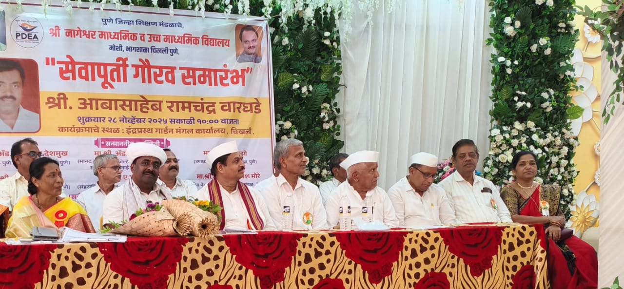 पुणे प्रतिनिधी प्रबोधिनी न्युज नेटवर्क – श्री. नागेश्वर विद्यालय मोशी भागशाळा चिखली येथे कार्यरत असलेले श्री. आबासाहेब रामचंद्र वारघडे नियत वयोमानानुसार दिनांक ३० नोव्हेंबर २०२५ रोजी सेवानिवृत्त झाले. सेवापूर्ती गौरव समारंभ विद्यालयाचे प्राचार्य सानप, उपमुख्याध्यापिका नाणेकर, पर्यवेक्षिका ठोंबरे व पंडित यांच्या मार्गदर्शनाखाली इंद्रप्रस्थ गार्डन मंगल कार्यालय या ठिकाणी संपन्न झाला.