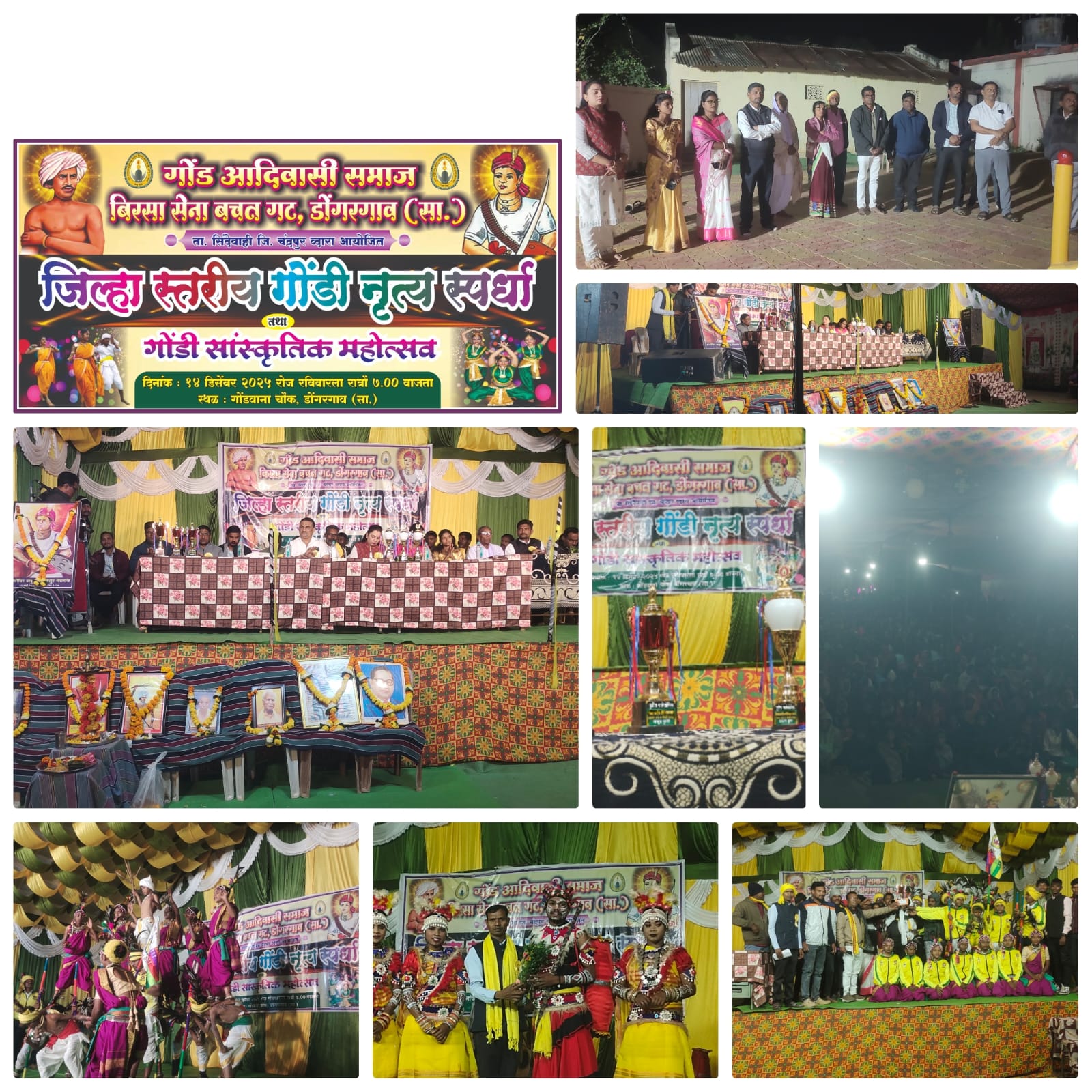 गोंड समाज तथा बिरसा सेना बचतगट डोंगरगाव सा. यांच्या वतीने जिल्हा स्तरीय गोंडी नृत्य स्पर्धा तथा गोंडी सांस्कृतिक महोत्सव २०२५ या कार्यक्रमाचे आयोजन करण्यात आले. कार्यक्रमाला उद्घाटक म्हणून मा. जयश्री कावळे संचालिका कृ.उ.बा.स.सिंदेवाही, कार्यक्रमाचे अध्यक्ष म्हणून मा. राहुल बोडणे सरपंच ग्रा.पं. नवरगाव, कार्यक्रमाचे विशेष अतिथी म्हणून गोंडी गायक सुरेश वलादी, राहुल कन्नाके सर यवतमाळ, माधुरीताई सुरपाम सरपंच, रमाकांतभाऊ लोधे तालुका अध्यक्ष का. क. सिंदेवाही, सुनिल पेंदाम, मिलिंद कोवे, घनश्याम पेंदाम, मुरली मडावी, योगेश लोंढे पो. पा., गणेश हांडेकर त.मु. स.अध्यक्ष, शिल्पा बन्सोड, नकुल पेंदाम आदी मान्यवरांच्या उपस्थित पार पडले. कार्यक्रमाप्रसंगी स्पर्धेचे परीक्षक सुरेशदादा वेलादी सर यांनी गोंडी संस्कृतीचे जतन, संवरक्षण, आणि गोंडी संस्कृती टिकविण्यासाठी युवापिढीने पुढाकार घ्यावा असे मार्गदर्शन केलेत. हा कार्यक्रम यशस्वी करण्यासाठी रुपेश सुरपाम, प्रशांत मडावी, बिरसा सेना बचतगटाचे सर्व सभासद तसेच गोंड समाजाच्या सर्व महिला पुरुषांनी सहकार्य केलेत. कार्यक्रमाचे सूत्रसंचालन दिनेश वलके, दिलेश सहारे यांनी केला तर पाहुण्यांचे आभार निकेश वेटे यांनी मानलेत. कार्यक्रम यशस्वी करण्यासाठी करण सुरपाम, प्रणय हांडेकर, तसेच सर्व डोंगरगाव वासीय जनतेनी सहकार्य केलेत.