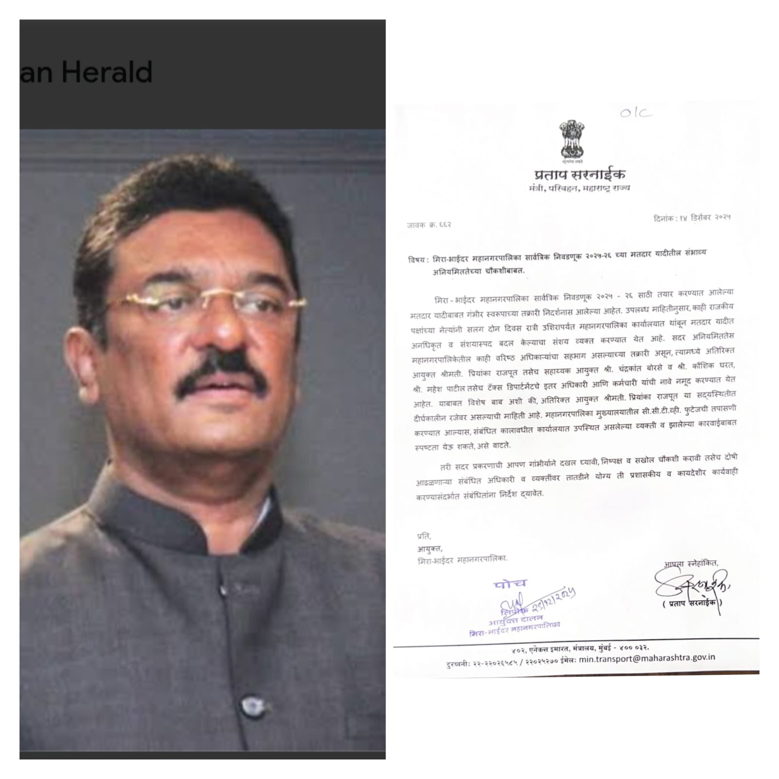 मीरा-भाईंदर प्रतिनिधी प्रबोधिनी न्युज – मीरा-भाईंदर महानगरपालिकेच्या आगामी सार्वत्रिक निवडणूक २०२५-२६ साठी तयार करण्यात आलेल्या मतदार यादीत गंभीर स्वरूपाच्या अनियमितता झाल्याचा संशय व्यक्त करण्यात आला असून, या प्रकरणाची सखोल चौकशी करण्याचे आदेश महाराष्ट्र राज्याचे परिवहन मंत्री तथा पालकमंत्री प्रताप सरनाईक यांनी दिले आहेत.
