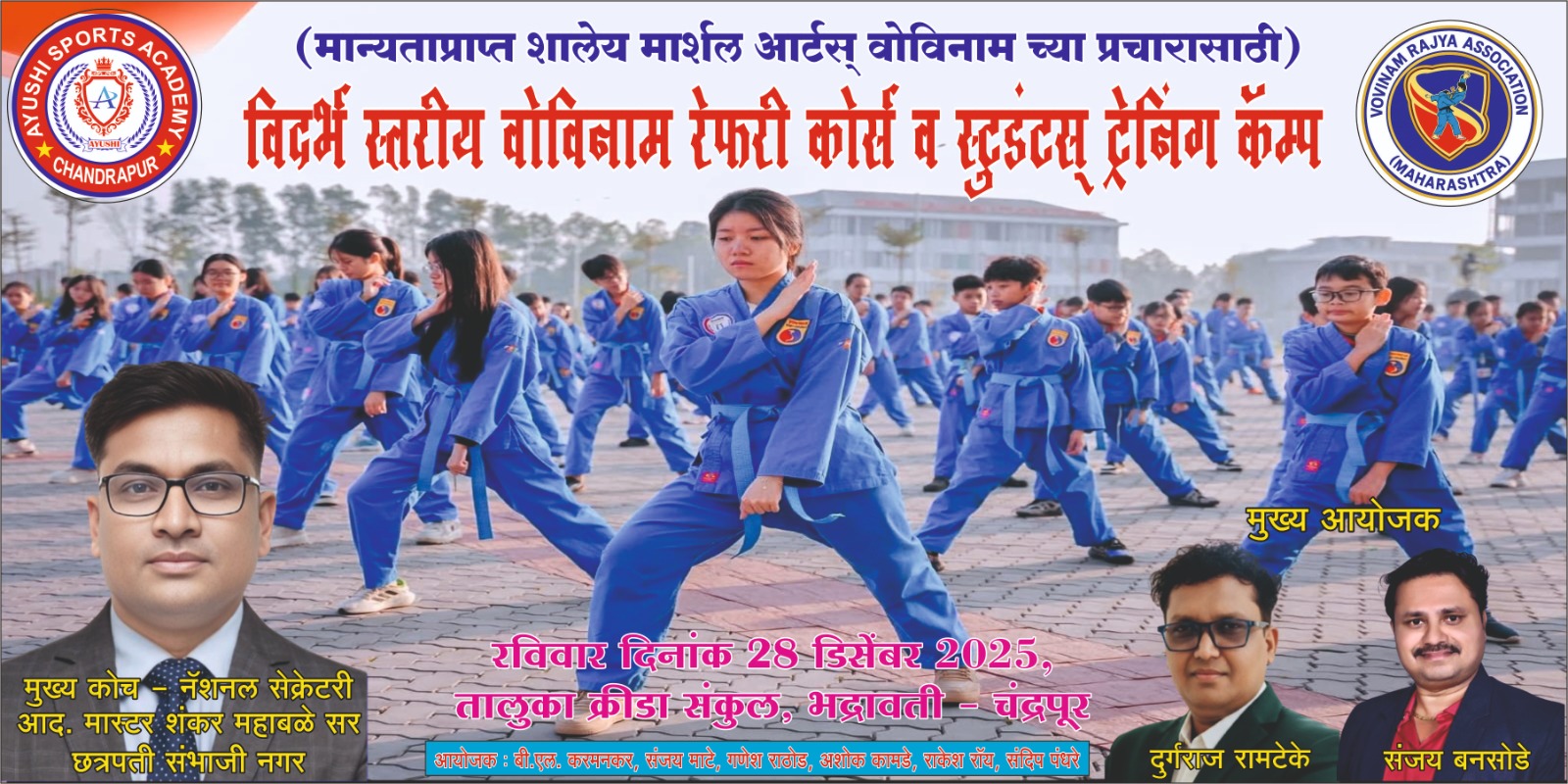 स्कुल गेम्स फेडरेशन आणि इंडिया(SGFI)- क्रीडा मंत्रालय भारत सरकार द्वारा मान्यताप्राप्त सेल्फ डिफेन्स मार्शल आर्ट्स वोविनाम या क्रीडा प्रकाराचा चंद्रपुर जिल्हा सह संपुर्ण विदर्भा विभागात प्रसार करण्याच्या एकमात्र उद्देशाने भव्य एक दिवसीय विदर्भ स्तरीय वोविनाम रेफरी, जज ट्रेनिंग कोर्स ( 15 वर्षांवरील सर्व स्त्री.. पुरुष कोचेस , क्रीडा शिक्षक यांच्या करीता) व विदर्भ स्तरीय वोविनाम स्टुडंट्स ट्रेनिंग कॅम्प (06 ते 60 वर्षे वयोगटातील सर्व इंटरेस्टिंग स्टुडंट्स, स्त्री पुरुष यांच्या करीता ) चे आयोजन दिनांक 28 डिसेंबर 2025 रविवार सकाळी 08 वाजता पासुन स्थानिक तालुका क्रीडा संकुल,भद्रावती, चंद्रपुर येथे करण्यात आले आहे.