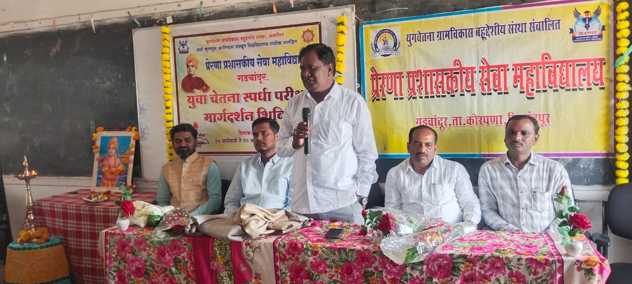 नम्रता सरदार मुख्य संपादिका प्रबोधिनी न्युज – गडचांदूर : परीक्षेला सामोरे जाताना नियोजनबद्ध अभ्यास आणि सातत्य फार महत्त्वाचे असते. त्यामुळे विद्यार्थ्यांनो थांबू नका, निरंतर अभ्यास चालू ठेवा यश तुम्हाला नक्कीच मिळेल, असे प्रतिपादन गडचांदूर नगर परिषदेचे नवनियुक्त उपाध्यक्ष मा. संजय मेंढी यांनी केले ते युग चेतना ग्रामविकास बहुउद्देशीय संस्थेद्वारा संचालित प्रेरणा प्रशासकीय सेवा महाविद्यालयात युवकांचे प्रेरणास्थान स्वामी विवेकानंद यांच्या जयंती प्रित्यर्थ आयोजित ‘युवा चेतना’ स्पर्धा परीक्षा मार्गदर्शन शिबिराच्या उद्घाटनप्रसंगी बोलत होते. उपाध्यक्ष मा. संजयजी मेंढी यांच्या शुभहस्ते शिबिराचे उद्घाटन करण्यात आले.अध्यक्षस्थानी प्रेरणा प्रशासकीय महाविद्यालयाचे उपाध्यक्ष मा. बालाजी पुरी होते. यावेळी गडचांदूर नगरपरिषदेचे युवा नगरसेवक तथा उद्योजक मा. तुषार अशोकराव बावणे, टाटा समूह शासकीय अभियांत्रिकी महाविद्यालय (चंद्रपूर) येथील मा. प्रदीप चामले सर,जालना येथील मा. तेजस्विनी कवठे मॅडम , मा. धनश्री चिताडे , मा. अरविंद मुसने, महाविद्यालयातील प्राध्यापक प्रामुख्याने उपस्थित होते.