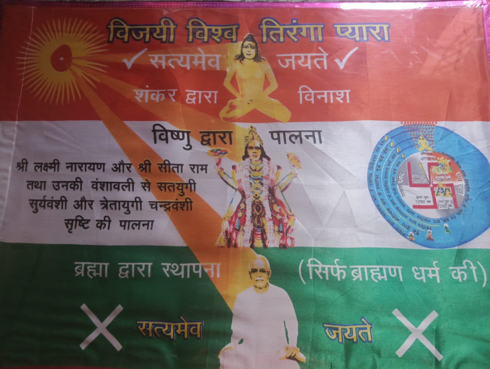 तिरंगा या शब्दातच तीन रंगांचा उल्लेख आहे, म्हणजेच तीन. तिरंग्याचे तीन रंग आहेत: तळाशी हिरवा, मध्यभागी पांढरा आणि वरती भगवा. हिरवा रंग हिरवळ दर्शवतो, पांढरा शुद्धता दर्शवतो आणि भगवा क्रांती दर्शवतो. देव स्पष्ट करतात. राजोप्रधान हिरवा रंग हा हिरवळ आणणाऱ्या ब्रह्माच्या स्थापनेला श्रद्धांजली आहे. ब्रह्माने विश्वाची निर्मिती आणि विष्णूचे पालनपोषण, पांढरे म्हणून दाखवले आहे, ते शांतीचे प्रतीक आहे. ब्रह्माने नवीन सतयुग जगाची स्थापना, आनंदी जगाची स्थापना, याचा अर्थ हिरवळ स्वतःच आनंदाच्या जगाचे प्रतीक आहे.