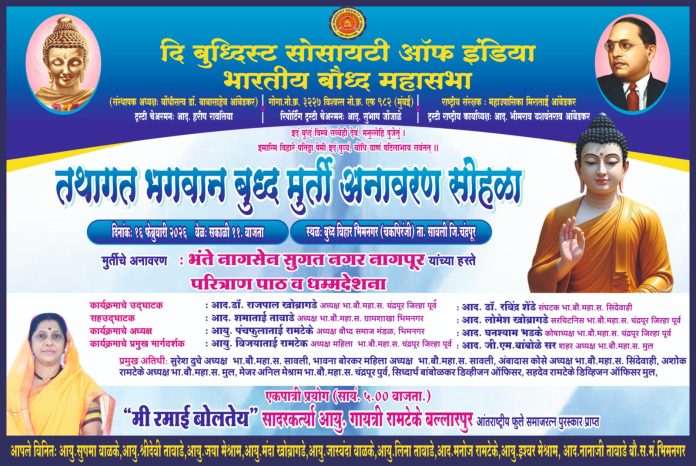 सावली प्रतिनिधी प्रबोधिनी न्युज नेटवर्क – भारतीय बौद्ध महासभा तथा बौद्ध समाज मंडळ भीमनगर (चकपिरंजी) तालुका सावली जिल्हा चंद्रपूर चे वतीने दिनांक १६/२/२०२६ रोजी सकाळी ११.०० वाजता तथागत भगवान बुद्ध मूर्ती अनावरण सोहळा स्थळ – बुद्ध विहार भीमनगर (चकपिरंजी) येथे भंते नागसेन सुगत नगर नागपूर यांचे हस्ते तथागत भगवान बुद्ध मूर्ती अनावरण सोहळा आयोजित करण्यात आला आहे.