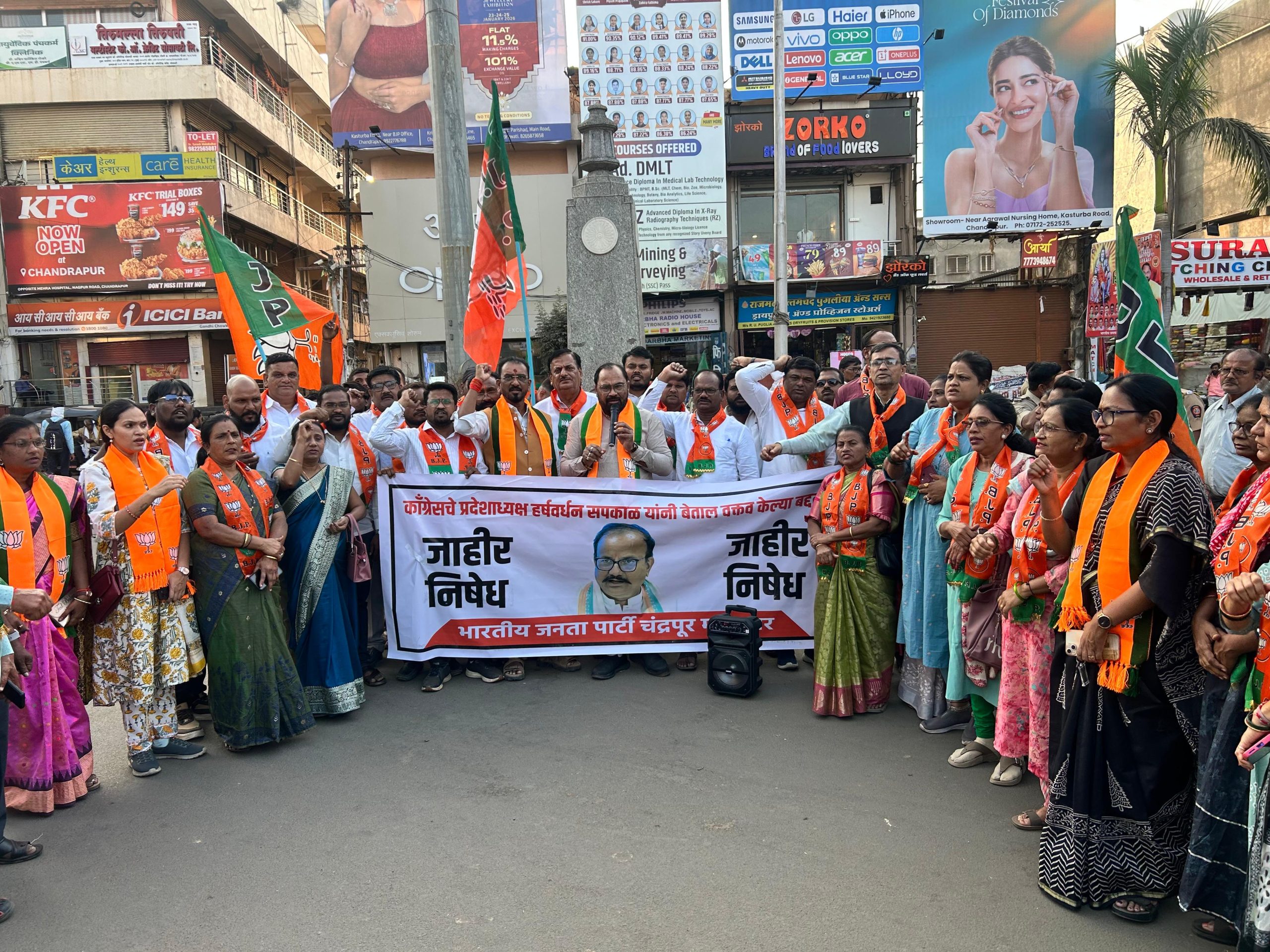 आमदार किशोर जोरगेवार यांच्या नेतृत्वाखाली झालेल्या या आंदोलनात यावेळी चंद्रपूर शहर महानगर माजी अध्यक्ष सुभाष कासनगोट्टूवार, प्रदेश कार्यकारणी निमंत्रीत सदस्य तषार सोम, मनपा गटनेते चंद्रशेखर शेट्टी, रवी गुरुनुले, महामंत्री नामदेव डाहुले, महामंत्री श्याम कनकम, बलराम डोडाणी, विधानसभा अध्यक्ष वंदना हातगावकर, दशरथसिंह ठाकूर, मंडळ अध्यक्ष स्वप्निल डुकरे, दिनकर सोमलकर, नगर सेविका शितल गुरुनुले, ज्याती जिवने, सरला कुळसंगे, अॅड सारिका संदुरकर, आशा देशमूख, मनपा नगर सेवक भालचंद्र दानव, नितेश गवळी, जितेश कुळमेथे, महिला महामंत्री सायली येरणे, घुग्घुस नगर सेवक आशिष मासिरकर, उमेश आयलु, प्रज्ञा बोरगमवार, मंजुश्री कासनगोट्टूवार, प्रविण गिलबिले, शशिकांत मस्के, चंद्रशेखर देशमूख, करणसिंह बैस, दिपक पाठक, अभिनव कोरकोपुलवार, अंकुश मडावी, अनिष दिक्षित, देवा कुंटा, आशु फुलझेले, रेश्मा पांडे, तसेच कार्यकर्ते मोठ्या संख्येने सहभागी झाले होते. घोषणाबाजी करत सकपाळ यांच्या विधानाचा तीव्र निषेध करण्यात आला.