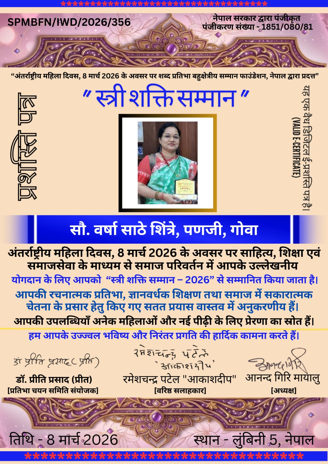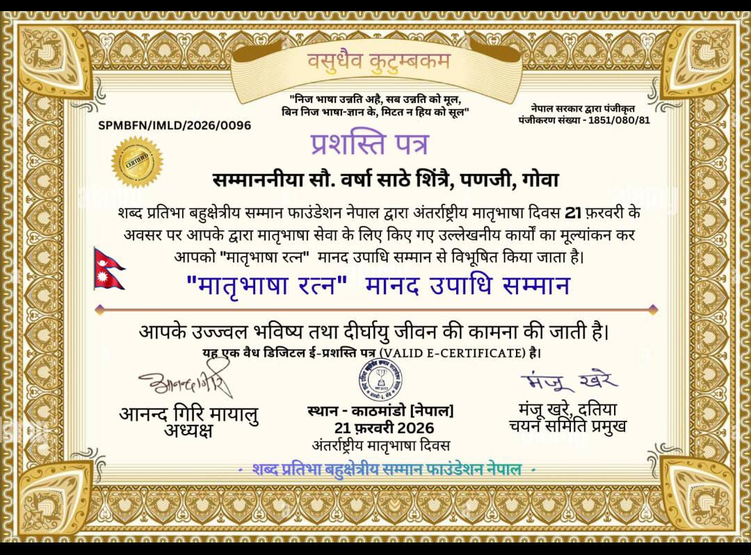 पणजी:आंतरराष्ट्रीय मातृभाषा दिनाचे औचित्य साधून नेपाळमधील एका प्रतिष्ठित संस्थेच्या वतीने पणजी, गोवा येथील सुप्रसिद्ध व्यक्तिमत्व माननीय वर्षा साठे शिंत्रे यांना ‘मातृभाषा रत्न’ या मानद उपाधीने सन्मानित करण्यात आले आहे. या आंतरराष्ट्रीय गौरवमुळे संपूर्ण गोव्यात आनंदाचे वातावरण असून गोवेकरांची मान अभिमानाने उंचावली आहे.