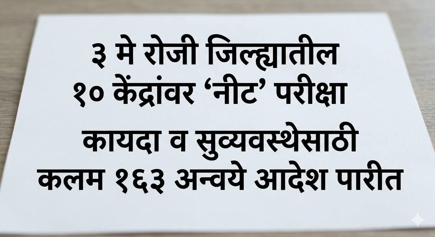 प्रशांत रामटेके संपादक प्रबोधिनी न्युज – चंद्रपूर – दि. 29 : नॅशनल इलिजिबिलीटी कम एन्टरन्स टेस्ट (नीट) परीक्षा 3 मे 2026 रोजी दुपारी 2 ते सायंकाळी 5 वाजेपर्यंत चंद्रपूर जिल्ह्यातील 10 केंद्रांवर आयोजित करण्यात आली आहे. सदर केंद्राच्या ठिकाणी परिक्षा सुरळीत पार पाडण्याच्या दृष्टीकोणातून 3 मे रोजी दुपारी 12 ते सायंकाळी 6 वाजेपर्यंत परीक्षा केंद्राच्या 100 मीटर परिसरात प्रतिबंध लागू करण्यात आले आहे. भारतीय नागरिक सुरक्षा संहिता2023 चे कलम 163 अन्वये जिल्हाधिकारी वसुमना पंत यांनी याबाबतचे आदेश निर्गमित केले आहे.